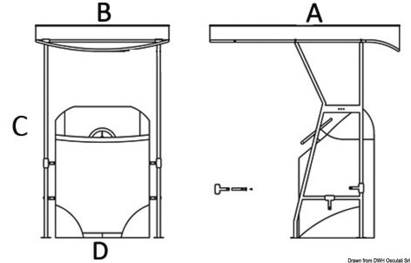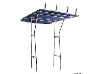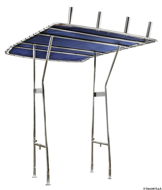 Fabbricati in tubo inox AISI 316 lucidato, Ø 35 mm (struttura della copertura Ø 28 mm). Universale essendo regolabili in larghezza fino ad un max di 140 cm ed un'altezza fino ad un max di 210 cm. Il tessuto del Top di colore blu UV resistente ed impermeabile, può essere smontato per la pulizia. Il T-TOP si può smontare sfilandolo dalle basi.