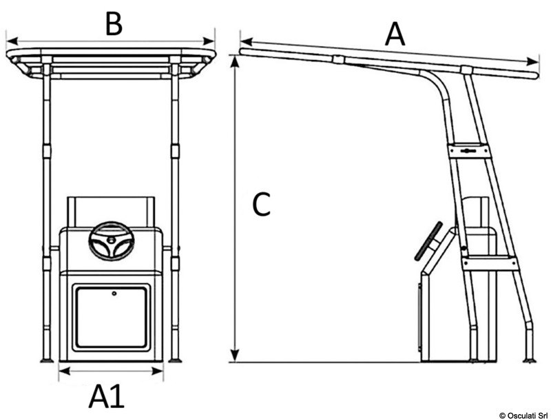 Fabbricato in tubo Ø 44 mm, con raccordi in resina ad alta resistenza e parti saldate di altissima qualità. Universale in quanto gli attacchi alla console possono essere regolati a piacere. Il tessuto del T-Top è poliestere ATLAS impermeabile ed UV resistente 400 g/m2.