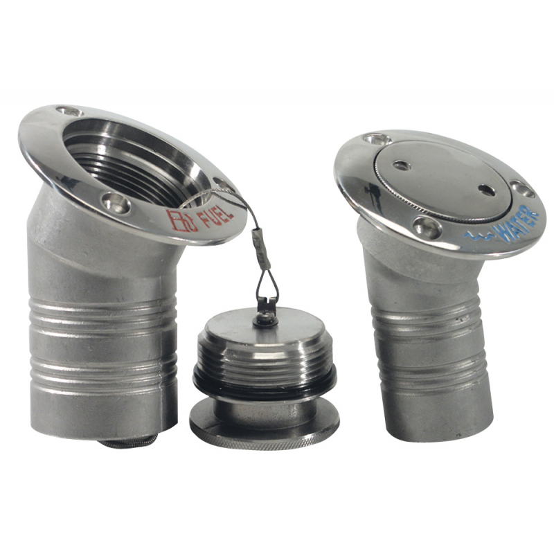 Tappo imbarco inclinato di 30° in fusione di acciaio inox AISI 316 lucidato a specchio completamente a filo, con cavetto inox di sicurezza e molla di richiamo A: 50 MM B: 102 MM C: 54 MM D: 84 MM Modello: FUEL