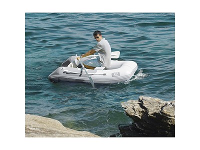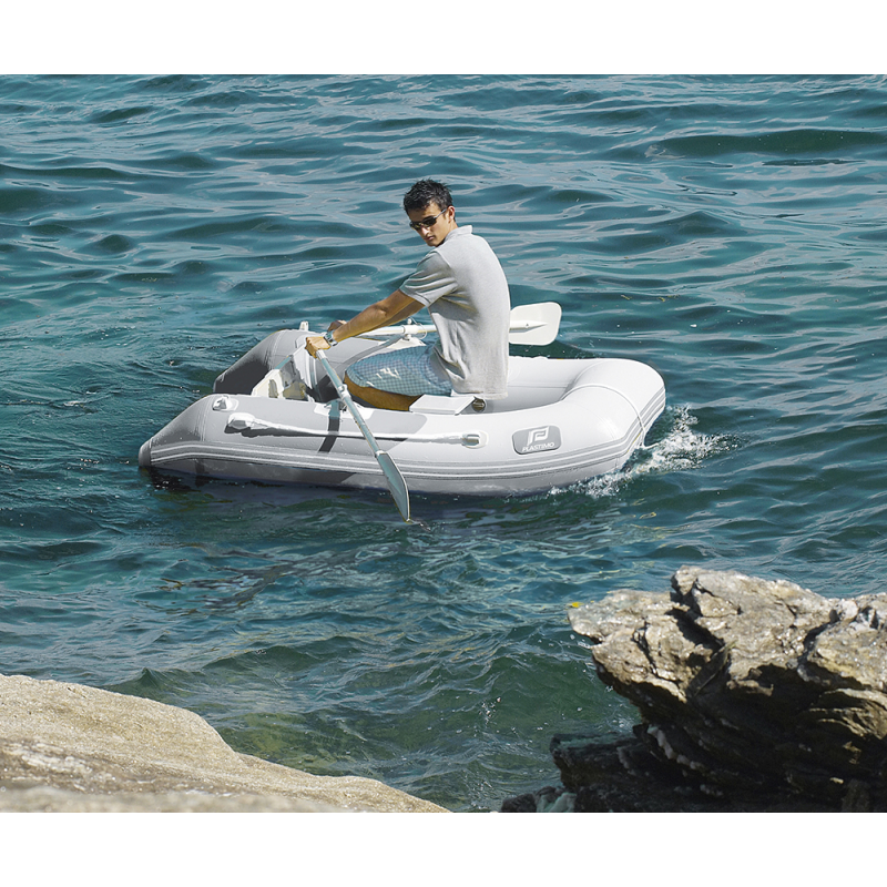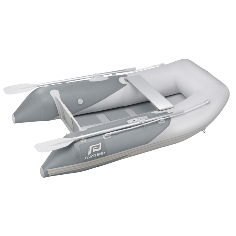 Tender Plastimo ad ampia prua quadrata per un maggior spazio a bordo e coni poppieri rinforzati e dal design innovativo che ne facilita la planata. Dotato di pagliolo a listelli, sedile in alluminio e anelli di rimorchio adatto per nr. 3 adulti ed un bambino e ad un carico massimo di 450kg., diametro dei tubolari cm.40,due comparti con sedile in alluminio, dotato di sacca per trasporto, kit di riparazione, gonfiatore e due pagaie. Fondo con stecche di larghezza cm.35. Potenza massima del motore 7,4kw (10HP) . Dim.cm. 269 x 150 x 53, peso kg. 27
