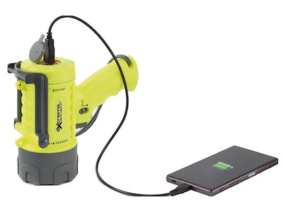 - provvista di presa USB piccola per ricarica e grande per poter usare la torcia come fonte di energia per ricarica cellulari; galleggiante.