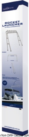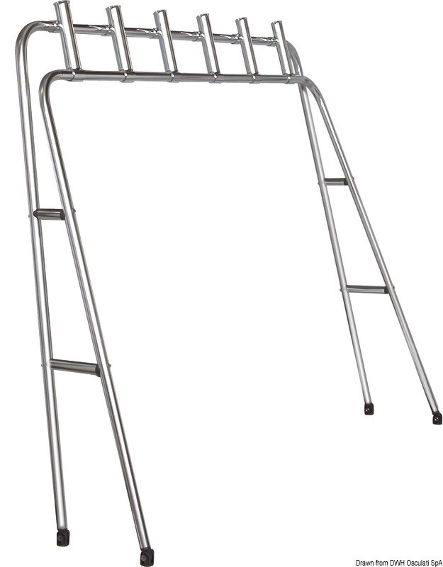 Fabbricata in alluminio anodizzato, con tubi Ø 32 mm. Completa di 6 portacanne e di tutti gli accessori per il montaggio. Se inutilizzata la torre può essere ripiegata sul trincarino.