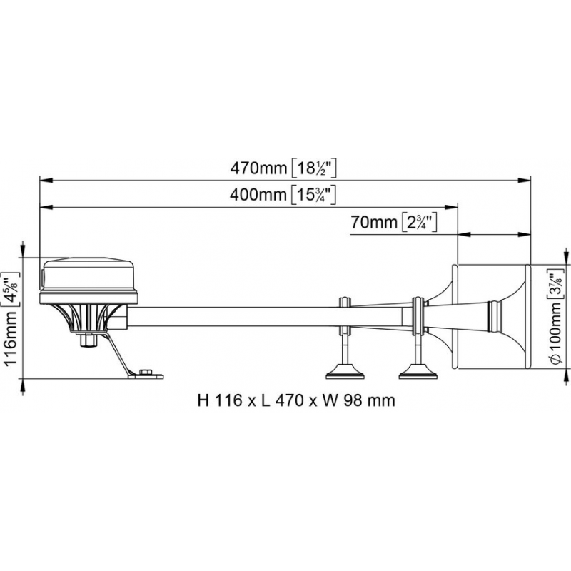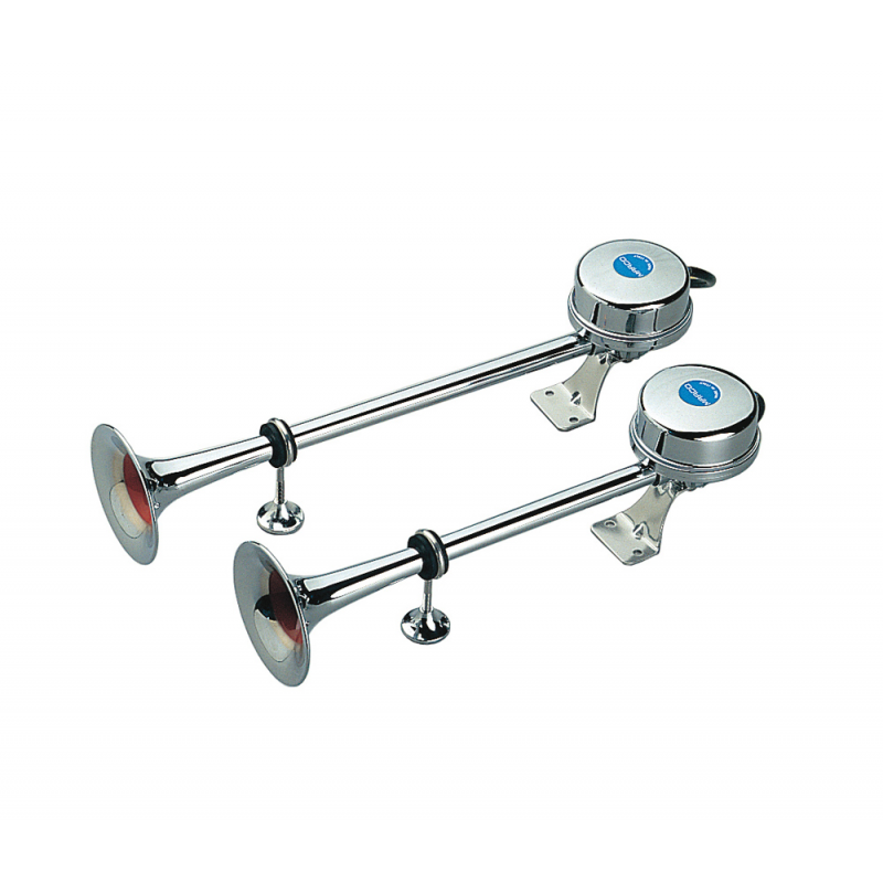 Coppia tromba elettromagnetica con cornettiin acciaio inox, suono bitonale potente e chiaro, udibilità in mare mt.1.800, Livello sonoro 121 dB, 320/370 Hz.Lungh. mm. 400 e 470.