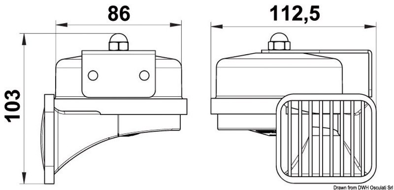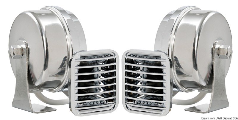 Corpo in ABS cromato con supporto in acciaio inox lucidato a specchio. Potenza singola tromba 115 + - 5 dB.