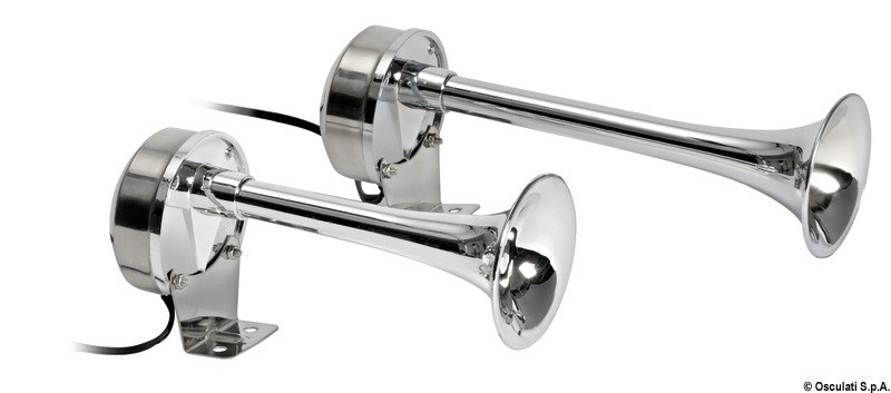 Corpo in acciaio inox lucidato a specchio e corno in ABS cromato. Suono singolo o bitonale.