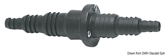 In polipropilene con flapper interno in gomma. Portagomma. Si può usare per svariati usi affinchè l’acqua vada in una sola direzione.