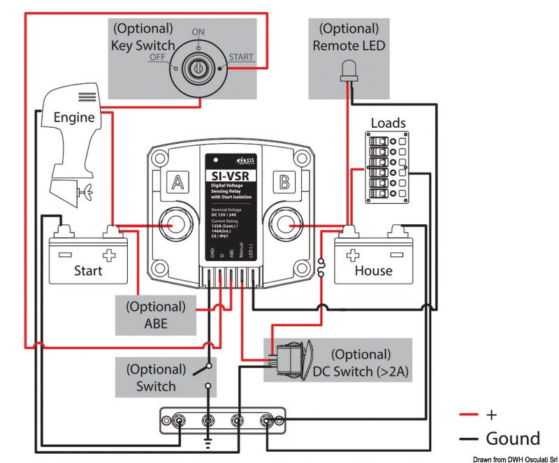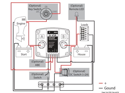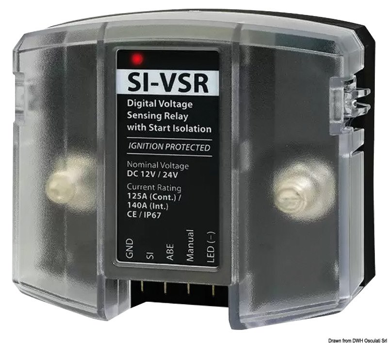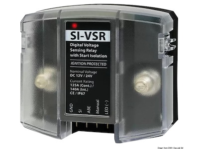 A motore spento, quando il voltaggio scende sotto 12,8/25,5 V apre il contatto e separa le due batterie, evitando così di scaricare la batteria sbagliata.