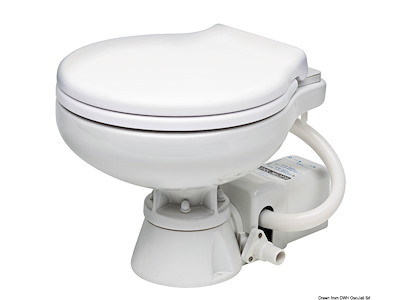 Provvisto di pompa autoadescante in bronzo con girante in neoprene. Funziona premendo un pulsante. Motore a magneti permanenti e albero in acciaio inox, con maceratore incorporato. Sedile e coperchio di colore bianco. Tubo d’entrata da 19 mm (3/4") e d’uscita da 25 mm (1”). Pannello di comando INCLUSO.