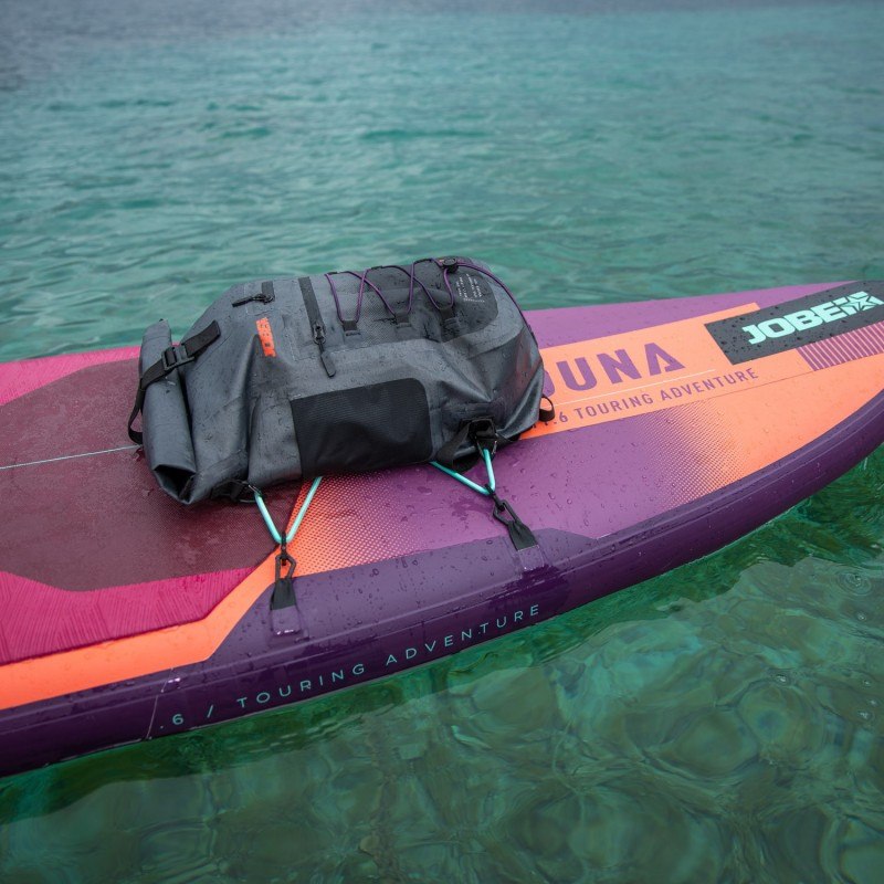 Rivestito in tela 420D TPU. Con spallacci e fascia toracica regolabile, 2 tasche esterne impermeabili, una tasca per inserire un laptop da 15 pollici, 2 tasche elastiche porta bottiglie e 4 clip a moschettone per fissarlo alla tavola da Sup.